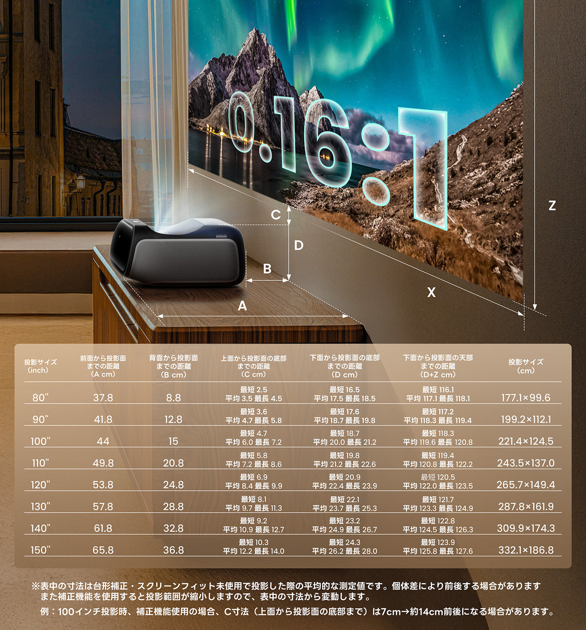 投影距離は、台形補正のかかっていない状態で、7cmで70 インチ、8.8 ㎝で80 インチ、 15 ㎝で100 インチ、24.8cmで120 インチ、36.8 ㎝で 150 インチになります。
