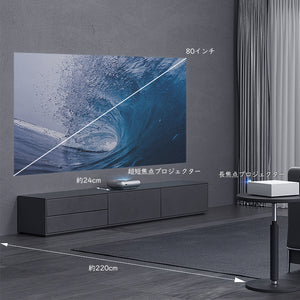 スローレシオ0.25:1の超短焦点設計により投影面から約24cm離すだけで80インチの大画面映像が投影可能。必要なスペースは投影面の下のごくわずかです。